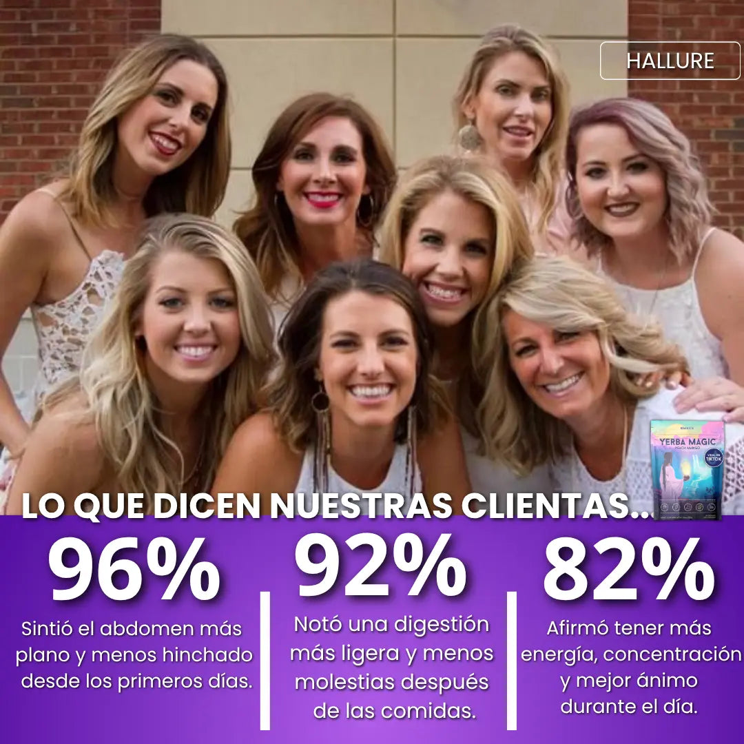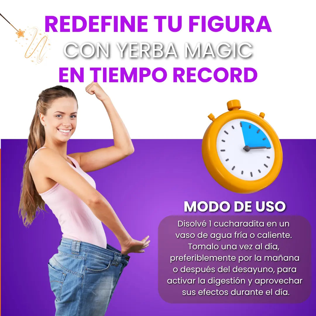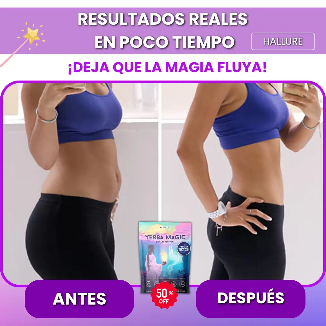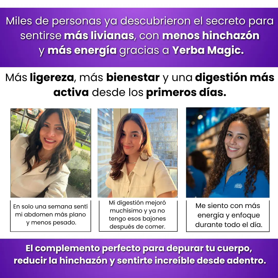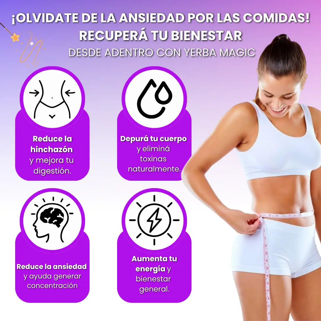 Gracias a su combinación de ingredientes naturales con propiedades digestivas y depurativas, Yerba Magic™ ayuda a eliminar toxinas, controlar el apetito y equilibrar tu metabolismo, promoviendo un abdomen más plano y una sensación de ligereza constante.